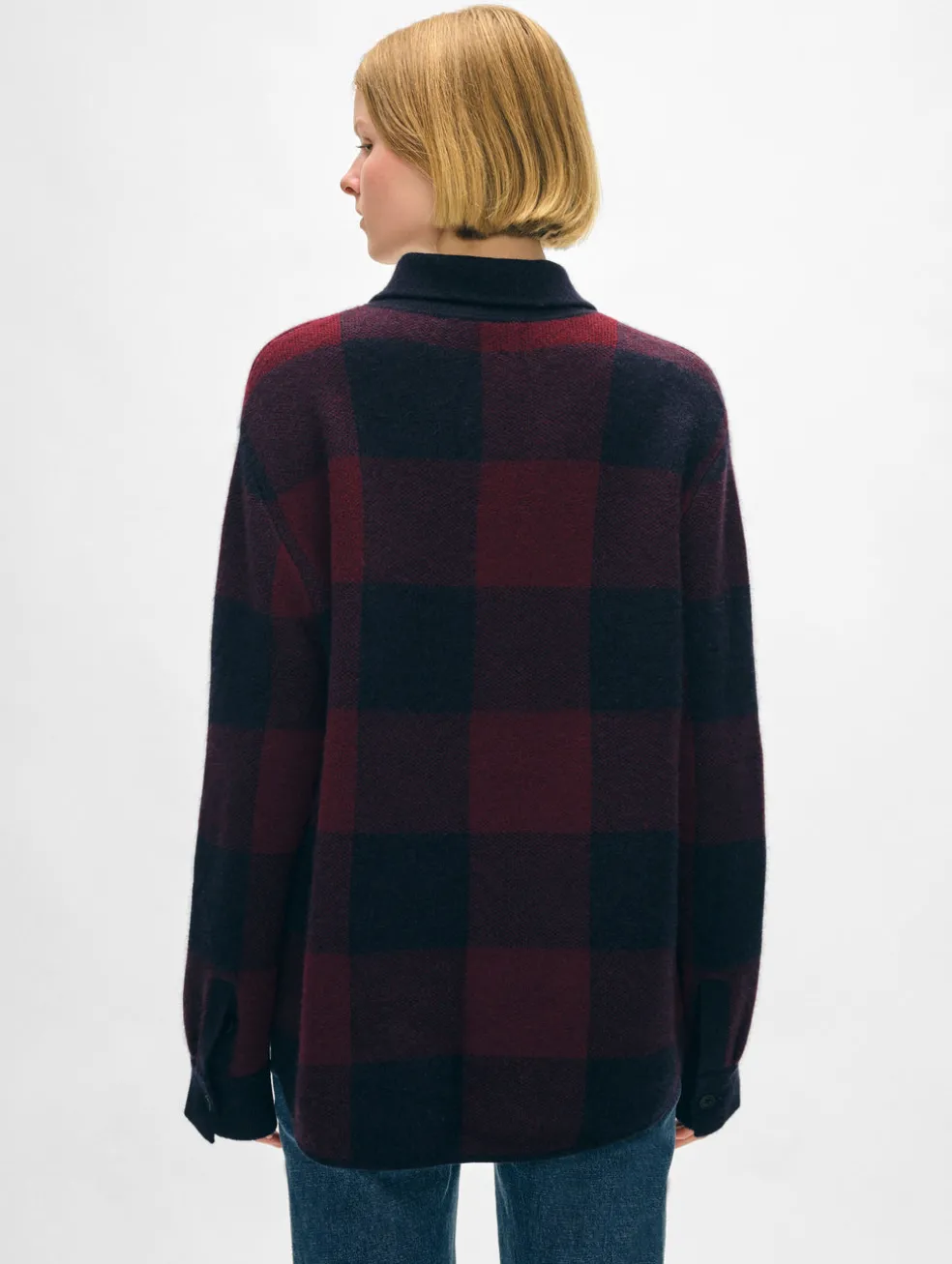 The season’s interpretation of the shacket is both incredibly cool and luxurious. The buffalo check motif is reminiscent of a well-loved flannel shirt, while our luxe cashmere delivers a structured yet fluid drape. Front flap pockets complete the design. Team the oversized knit with a white tee, straight-leg jeans and ankle boots.
