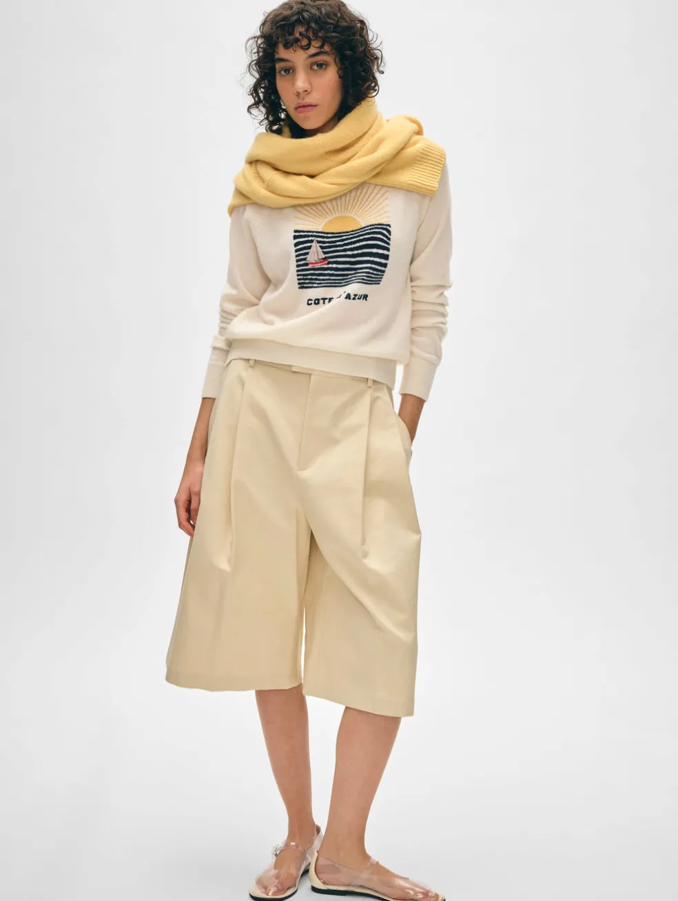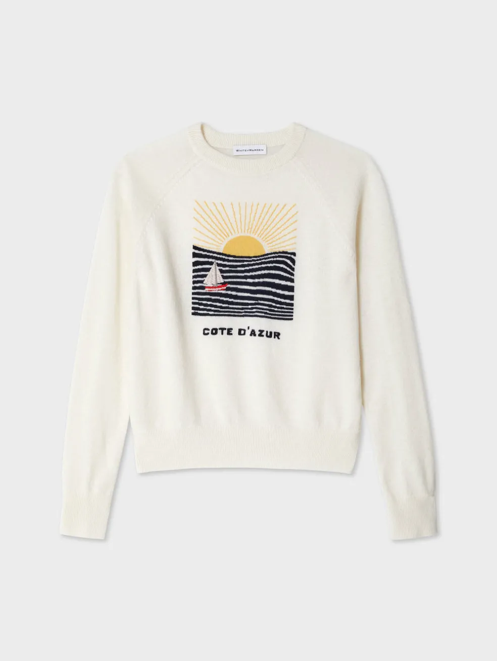 Riviera chic goes casual with this sweatshirt, which draws inspiration from a vintage Cote D’Azur postcard. Knit from our signature cashmere, the head-turning intarsia depicts a sunset and seascape along with a hand-embroidered sailboat. Consider it a must-have in any beach vacation capsule wardrobe.