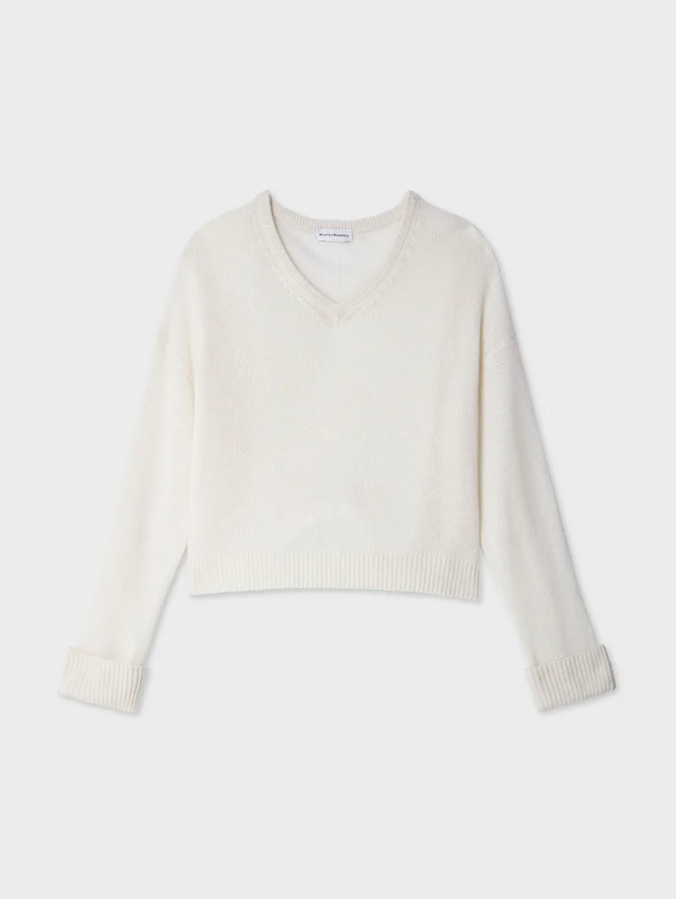The Cuffed V Neck strikes the perfect balance between relaxed and refined. Featherweight cashmere renders this sweater a great option for transitional wear, while double cuffed sleeves frame the oversized, cropped shape. Wear yours with neutral tailoring or faded jeans.