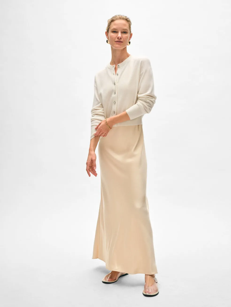 For more dressed-up affairs, our crewneck cardigan features a head-turning rhinestone button design. Made of soft, classic-weight cashmere responsibly sourced from Mongolia, this cardigan offers a straight fit that hits at the high hip. It’s a must-have piece to button up with tailored trousers or layer over a party dress, making it perfect for the holiday season and beyond.