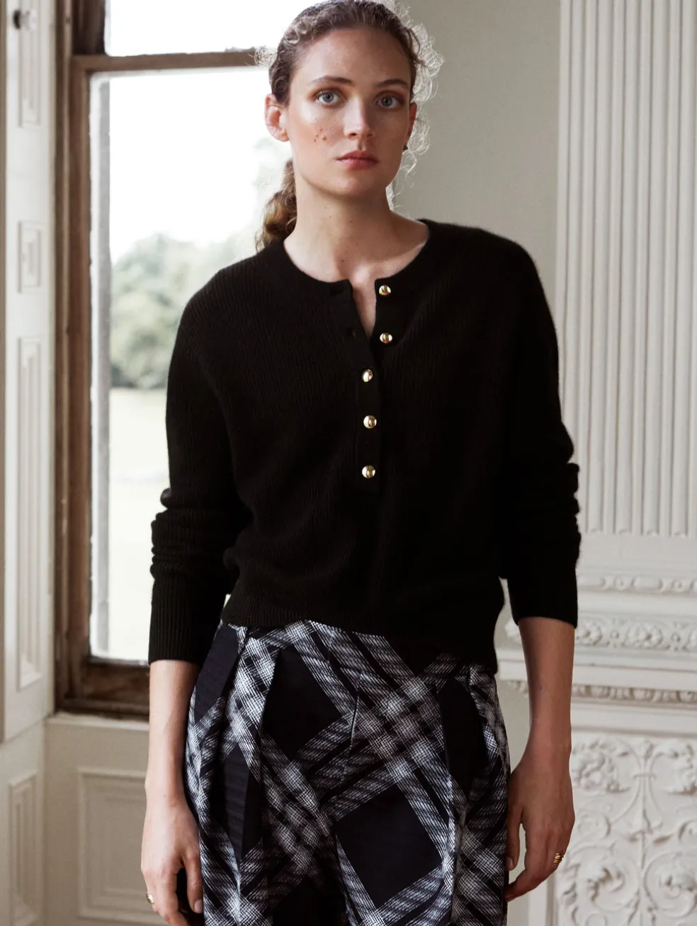 Last-minute dinner plans and evenings out call for this refined Henley sweater. With a relaxed fit and ribbed cashmere texture, it combines ease and elegance in one chic piece. Gold-tone buttons add a dose of unexpected shine. Layer it under a tailored blazer or long cardigan for added warmth and style.