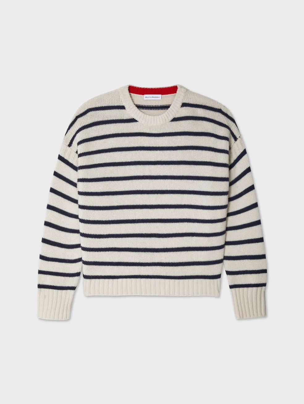 Five ends of a merino wool and cashmere blend were used to create this sweater’s sumptuous handle. Equal parts stylish and comfortable, the crewneck style is designed in an oversized shape with drop shoulder sleeves and a mid-hip length. What’s more? The underside of the collar is tipped in a contrasting color for unexpected contrast. Ground the striped style with tailored pants and minimal accessories during the day.